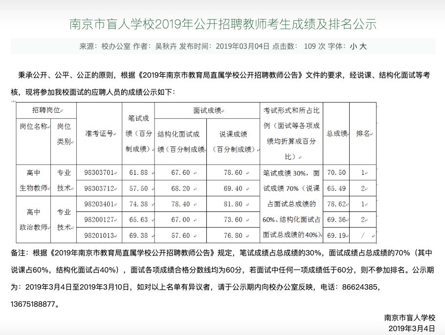 記者在南京市盲人學校網站上看到,鄭榮權的筆試和面試總成績名列第一位。但面試通過后,他的體檢結論為“不合格”,主要是因為視力問題。鄭榮權認為,他完全有能力勝任盲校的教師崗位。他說:“不論從我個人的實踐經歷來說,還是從已經在盲校工作的教師來說,或者是相關專家的研究,沒有一個實例證明盲人不能在盲校教書。”