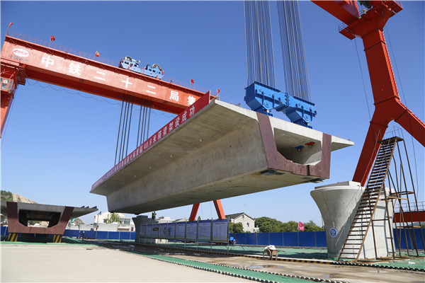 5月12日,中鐵二十二局集團建設者駕駛兩臺提梁機,把首片千噸箱梁架設在南沿江城際鐵路跨疏港特大橋上(央廣網發 侯欽佩 攝)