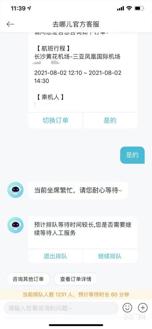 易女士說(shuō),這幾天,平臺(tái)和航空公司的客服電話很難打通,網(wǎng)絡(luò)客服排隊(duì)上千人。遇到同樣問(wèn)題的還有湖南的廖女士,她是在智行機(jī)票app提交了全額退款申請(qǐng),也被拒絕了:“智行軟件是晚上1:41給我們發(fā)信息說(shuō)訂票不滿足全退條件,無(wú)法辦理航班的一個(gè)非自愿退票。”