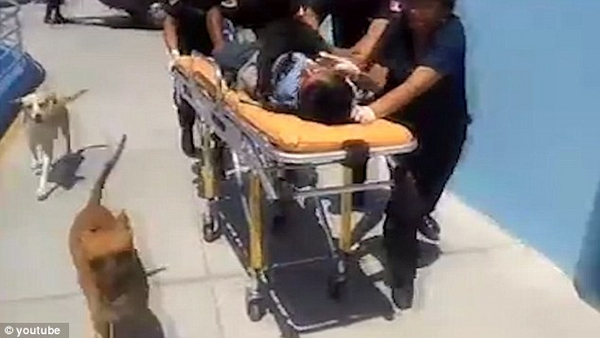 醫院安保錄像顯示,該男子在等待接受治療時,其中一只寵物狗跳上了擔架床,陪昏迷男子一起躺著;另一只寵物狗則坐在擔架床邊,目不轉睛地守護著。最后,該昏迷男子被送去接受治療,而兩只寵物狗仍絲毫不放松,靜候一旁。