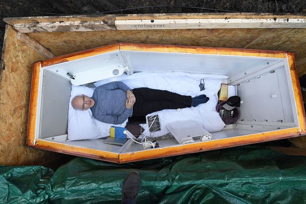 他花了3天的時間在貝爾法斯特的一座教堂外挖了一個深坑,并將一口巨大的棺材放入其中。棺材留有通風口,其內(nèi)還放置了一盞臺燈、一臺筆記本電腦以及電源和網(wǎng)線,以便他能夠在棺材里上網(wǎng)進行免費在線直播。