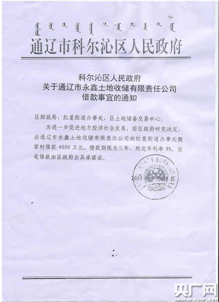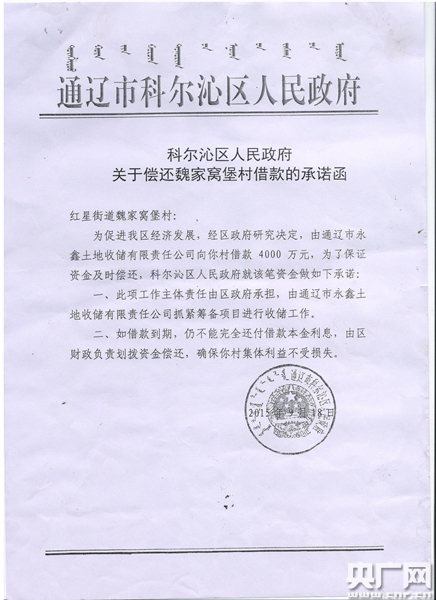 魏家窩堡村書記朱玉國告訴記者,借貸風險可控,因為有當地政府的擔保。據村民們提供的《科爾沁區人民政府關于償還魏家窩堡村借款的承諾函》記載:“為促進我區經濟發展,經區政府研究決定,由通遼市永鑫土地收儲有限責任公司向你村借款4000萬元,為了保證資金及時償還,科爾沁區人民政府就該筆資金作如下承諾:一、此項工作主體責任由政府承擔,由通遼市永鑫土地收儲有限責任公司抓緊籌備項目進行收儲工作。二、如借款到期,仍不能完全還付借款本金利息,由區財政負責劃撥資金償還,確保你村集體利益不受損失。”