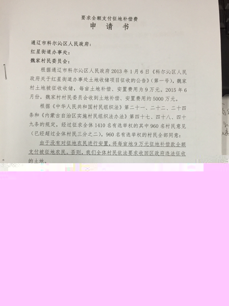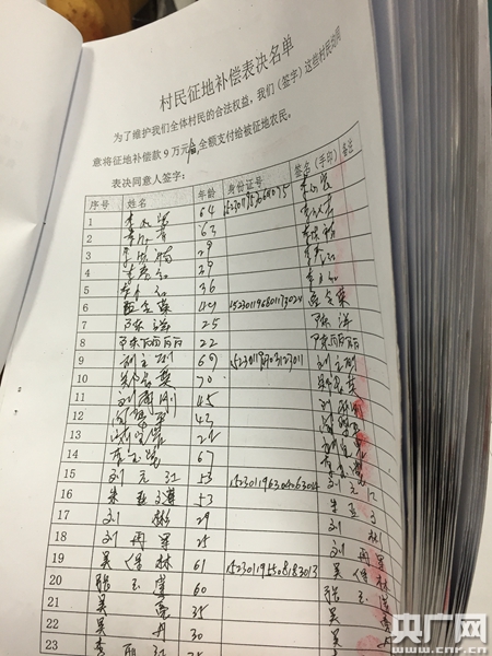至今,對于這樣的分配方式,當地村民仍不能接受。采訪中,他們還向記者提供了一份《要求全額支付征地補償費申請書》,《申請書》中寫道:“經過征求全體1410名有選舉權的其中960名村民意見(已經超過全體村民三分之二),960名有選舉權的村民全部同意:由于沒有對征地農民進行安置,將每畝地9萬元征地補償款全額支付被征地農民。”附頁中是960名村民的征地補償表決名單,共計44頁。