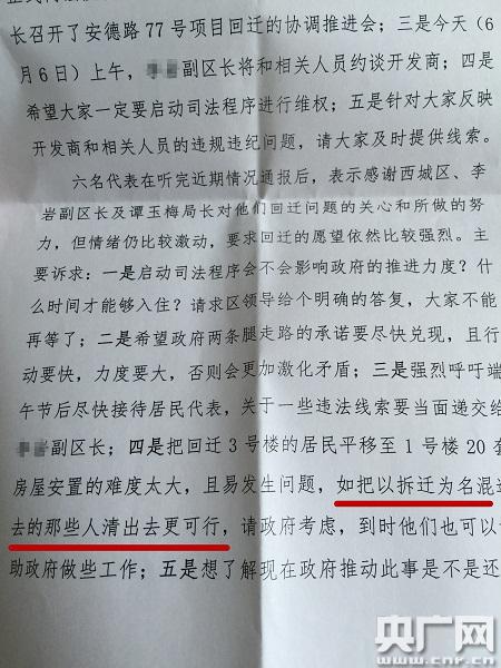 6月6號(hào),西城區(qū)房管局應(yīng)急與信訪(fǎng)科給上級(jí)單位的一份接待77號(hào)院居民代表的情況中寫(xiě)道:“把回遷3號(hào)樓的居民平移至1號(hào)樓20套房屋安置的難度太大,且易發(fā)生問(wèn)題,如把以拆遷為名混進(jìn)去的那些人請(qǐng)出去更可行,請(qǐng)政府考慮”,并建議回遷戶(hù)啟動(dòng)司法程序維權(quán)。