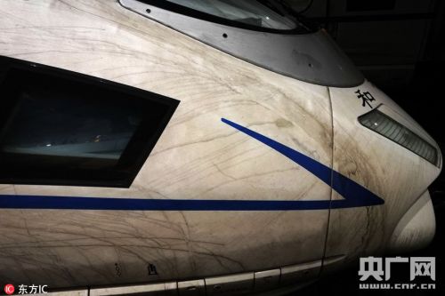央廣網北京1月5日消息(記者楊博宇)據中國之聲《新聞晚高峰》報道,近日,一組名為《穿越霧霾區的高鐵》的圖片報道在網上熱傳,報道中稱,1月2號,一列從上海開往北京南站的高鐵,在穿越華東、華北全部重霧霾區后未經雨水沖刷,塵埃布滿車身,白色的高鐵顯得灰頭土臉。圖片被大量轉發后引發了人們的關注,穿越霧霾區的高鐵究竟為何“變臉”?高鐵身上的黑色物質全都是因為霾嗎?