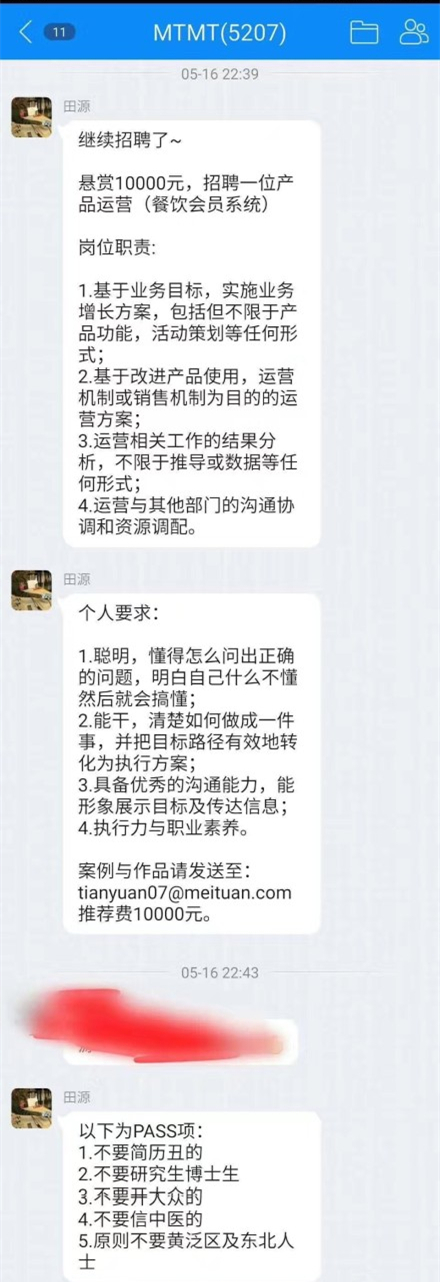 從微博爆料出來的截圖上看,這則招聘信息是發布在標注為“MTMT”的qq群里。發布人在群里的名字叫田源,信息上稱“懸賞一萬,招聘一位產品運營”,崗位職責是“基于業務目標,實施業務增長方案”等,發布者的個人要求是,“聰明,能干,具有執行力與職業素養”等。在這兩條信息后,發布者還發布了5條限制,說“不要簡歷丑的,不要研究生博士生,不要開大眾的,不要信中醫的,原則不要黃泛區及東北人士”。