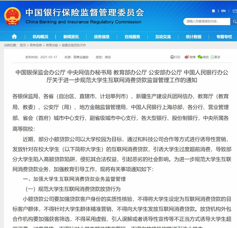 央廣網北京3月18日消息 據中央廣播電視總臺中國之聲《新聞有觀點》報道,3月17日,銀保監會、中央網信辦、教育部、公安部、中國人民銀行五部門聯合印發《關于進一步規范大學生互聯網消費貸款監督管理工作的通知》(以下簡稱《通知》),明確小額貸款公司不得向大學生發放消費貸款,花唄、借唄不能向大學生放款了?