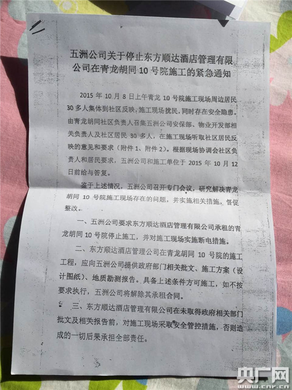 有居民給記者提供了一份蓋有公章的《五洲公司關(guān)于停止東方順達(dá)酒店集團(tuán)有限公司在青龍胡同10號院施工的緊急通知》,從內(nèi)容上可以推測,該院的業(yè)主單位是北京光華五洲公司紡織集團(tuán)公司。其官方信息顯示,該公司上級公司是北京市的一家國企北京光華紡織集團(tuán)有限公司。而10號院的承租方則是東方順達(dá)酒店管理公司,該公司在網(wǎng)上的公開資料并不多。附近的居民說,挖地下室是為了建旅館,而施工單位對外稱則要蓋古建,但該說法尚未得到官方確認(rèn)。