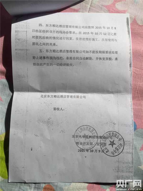 這份通知顯示,早在10月9號,五洲公司就要求“東方順達(dá)酒店集團(tuán)有限公司承租的青龍胡同10號院停止施工,并對施工現(xiàn)場實(shí)施斷電措施”,要求采取安全管控措施,否則承租合同自動解除。但這份通知的結(jié)尾簽收人東方順達(dá)酒店集團(tuán)并未蓋章簽字。
