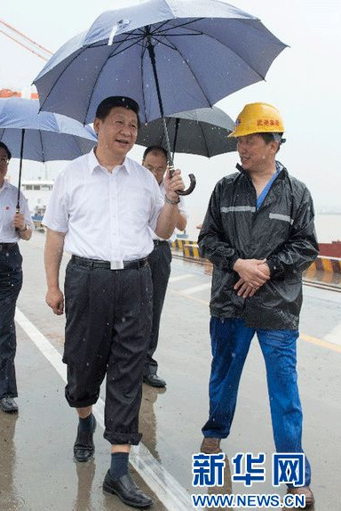 2013年7月21日,習近平冒雨來到武漢新港陽邏集裝箱港區考察