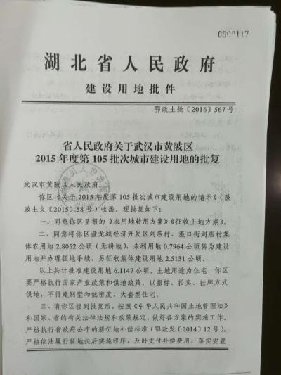 記者調(diào)查發(fā)現(xiàn),雖然案涉地塊2016才被湖北省政府批復(fù),由農(nóng)用地變更土地性質(zhì)為建設(shè)用地,但早在2002年,當(dāng)?shù)卣蛯⑦@塊土地交由武漢六建開發(fā),并讓武漢六建完成了“三通一平”(指基本建設(shè)項(xiàng)目開工的前提條件)和繳納了征地補(bǔ)償費(fèi)用。盤龍城經(jīng)開區(qū)管委會副主任胡莉萍解釋稱,當(dāng)時(shí)他們在履行這個協(xié)議,里面涉及到征地這一塊的工作,要與農(nóng)民對接,他們協(xié)助他做相關(guān)的工作。按照國家的相關(guān)政策,土地是要進(jìn)行補(bǔ)償?shù)摹?/p>
