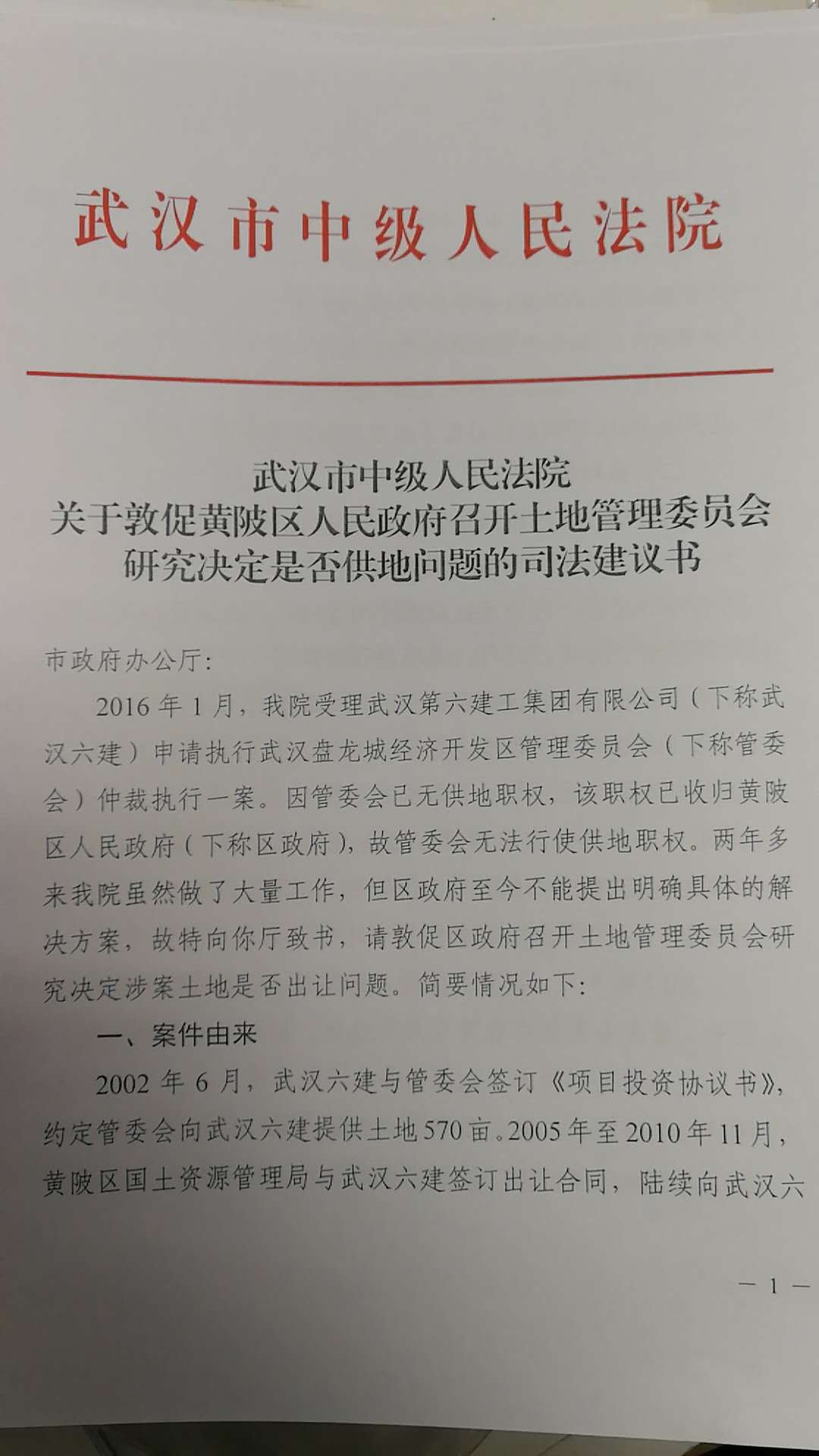 黃陂灄口經(jīng)濟(jì)發(fā)展區(qū)2003年更名為武漢盤龍城經(jīng)濟(jì)開發(fā)區(qū),黃陂第六建筑有限公司后來也更名為武漢第六建工集團(tuán)有限公司。協(xié)議約定的是出讓400畝,但到2010年,政府只為其辦理了200多畝的土地和規(guī)劃手續(xù)。雙方出現(xiàn)供地糾紛,按照協(xié)議約定,提請武漢仲裁委員會仲裁。2015年12月,武漢六建打贏了官司,但遭遇執(zhí)行難。目前,武漢市中院已三次發(fā)出敦促履行的通知書,最高法院也督辦兩次,武漢市委政法委也召開了專題會議,要求黃陂區(qū)政府盡快依法行政,但黃陂區(qū)政府仍未履行生效裁定。黃陂區(qū)政府主管副區(qū)長丁朝輝稱,中國之聲的報(bào)道播出后,區(qū)里第一時(shí)間開了專題會議。黃陂區(qū)委區(qū)政府非常重視,書記和區(qū)長都親自參加了專題會議。區(qū)政府的相關(guān)負(fù)責(zé)人和盤龍城開發(fā)區(qū)的主要負(fù)責(zé)人約見了六建公司的法人代表,雙方進(jìn)行了坦誠和務(wù)實(shí)地交流。