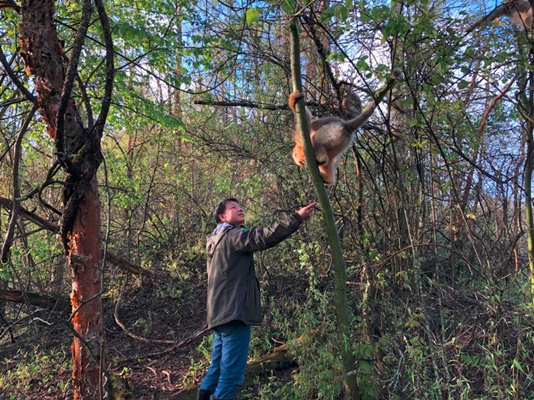 吳鋒和金絲猴握手問(wèn)好(央廣記者凌姝 攝)