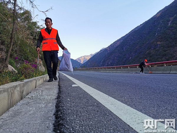 楊文忠在公路清潔養護(中央廣播電視總臺央廣記者 李騰飛 攝)