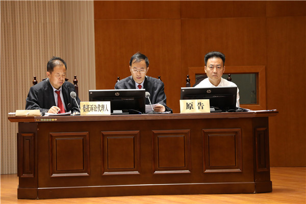 庭審現場:濮陽市市長楊青玖(右一)代表原告出庭,并在現場發表陳述意見(央廣網發 濮陽市中級人民法院供圖)