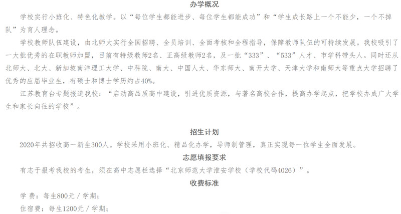 北師大淮安學校官方網站中寫到,學校是由淮安市人民政府、北京師范大學合辦,政府建校、北師大自主管理,集政府辦學的穩定性和民辦學校的自主性于一體,是一所按公辦高中收費標準運行的民辦非營利性學校。