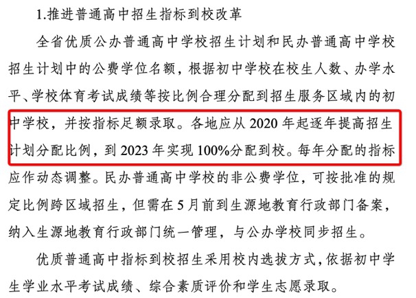2019年12月,云南省教育廳印發《關于進一步深化高中階段學校考試招生制度改革的實施意見》,其中提到,“各地應從2020年起逐步提高招生計劃分配比例,到2023年實現100%分配到校”。在一些家長看來,昆明的中考新政違背了云南省教育廳推進普通高中招生指標到校的時間節點要求。當地一位教育工作者呂老師告訴記者:“文件里說的是政策從初一的學生開始實行,但現在從初三的學生就要開始實行了。”
