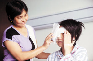 在天津醫(yī)科大學(xué)眼科中心的病房,記者見到了本月16日剛剛做完手術(shù)的劉靜環(huán)。她躺在病床上,右眼包裹著厚厚的紗布,盡管母親馬兆霞按照醫(yī)生的指示一直在用冰袋幫助女兒敷右眼部,但是她還是感到疼痛,左眼也被帶著有些腫。但她一直沒有喊疼,見有人進(jìn)病房,她立即讓母親扶自己坐起來。盡管眼部包著紗布,但仍然可以看出她是個清秀的姑娘,說起話來也斯文大方。