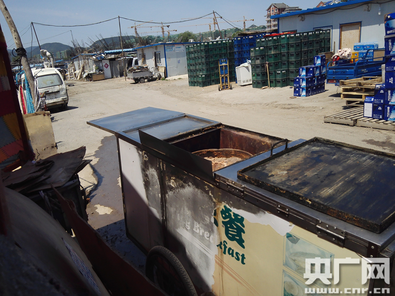 板房區(qū)域內(nèi)停放著不少做小吃、早點(diǎn)生意的推車,拉貨的板車或面包車