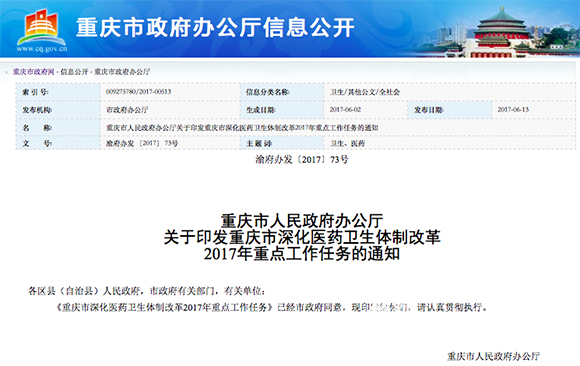 (記者 黃宇)13日,重慶市政府網公布了《重慶市人民政府辦公廳關于印發重慶市深化醫藥衛生體制改革2017年重點工作任務的通知》(以下簡稱《通知》),明確了全面推進公立醫院綜合改革的時間和范圍,要求在2017年8月底前,所有公立醫院啟動改革,全面取消藥品加成(中藥飲片除外),建立公立醫院由服務收費和政府補助兩個渠道補償的新機制,推動新舊運行機制平穩轉換。