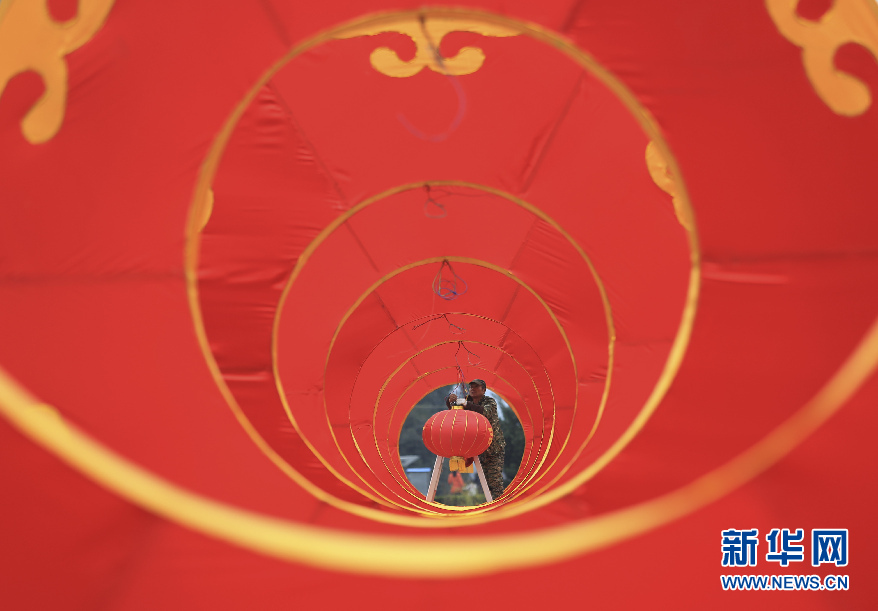 每到過年,重慶的大街小巷都會掛上火紅的燈籠以及五彩繽紛的裝飾,給新年帶來歡樂喜慶的氛圍。但是,在重慶迎春燈飾的背后,卻是燈匠工人辛勤的付出。因為他們,市民才能欣賞到這難得的新年美景。圖為工人師傅在重慶市北碚區縉云廣場安裝燈籠。新華網發 (秦廷富攝)