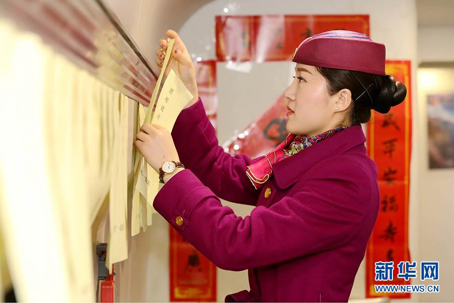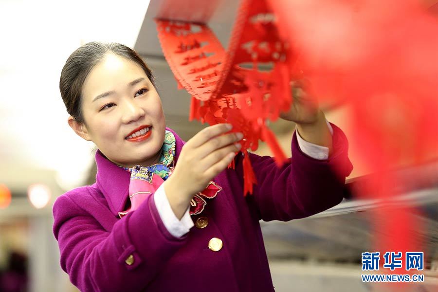 3月1日,D1867列車工作人員正在車廂內布置節日氛圍。新華網發(包亮 攝) -