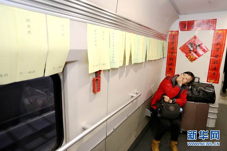 D1867列車上,乘務人員正與旅客一起猜燈謎。新華網發(包亮 攝) -
