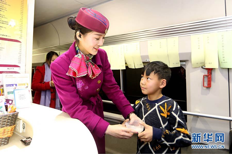 D1867列車上,列車工作人員為小旅客送上元宵。新華網發(包亮 攝) -