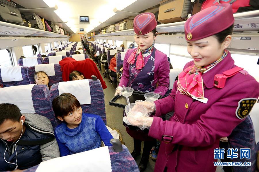 D1867列車上,列車工作人員為旅客送上元宵。新華網發(包亮 攝)