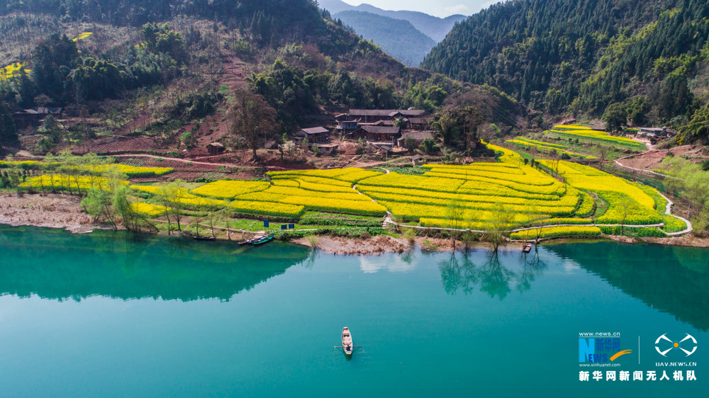陽春三月,春水初生,花海漸盛。在重慶市黔江區阿蓬江畔,油菜花海沿著江岸蔓延開來,正是半江春色半江水。圖為無人機航拍重慶阿蓬江春色,詩情畫意濃。新華網發(王江龍 攝)