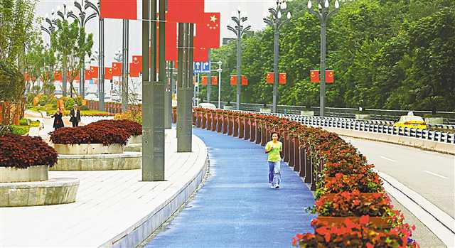 10月11日,江北區(qū)北濱路石門大橋至吉川路段,市民在拓寬改造后的景觀帶上慢跑。目前,北濱路嘉華大橋到石門大橋段綜合改造工程景觀提升進入收尾階段,嘉華大橋至吉川路口段改造基本完工,石門大橋至吉川路口段改造今年底完工。工程內(nèi)容包括路面拓寬、設(shè)置慢行系統(tǒng)、慢跑道、廣場式人行道及鮮花綠植等,打造時尚、悅動的濱江休閑景觀帶,為市民提供休閑娛樂的空間。