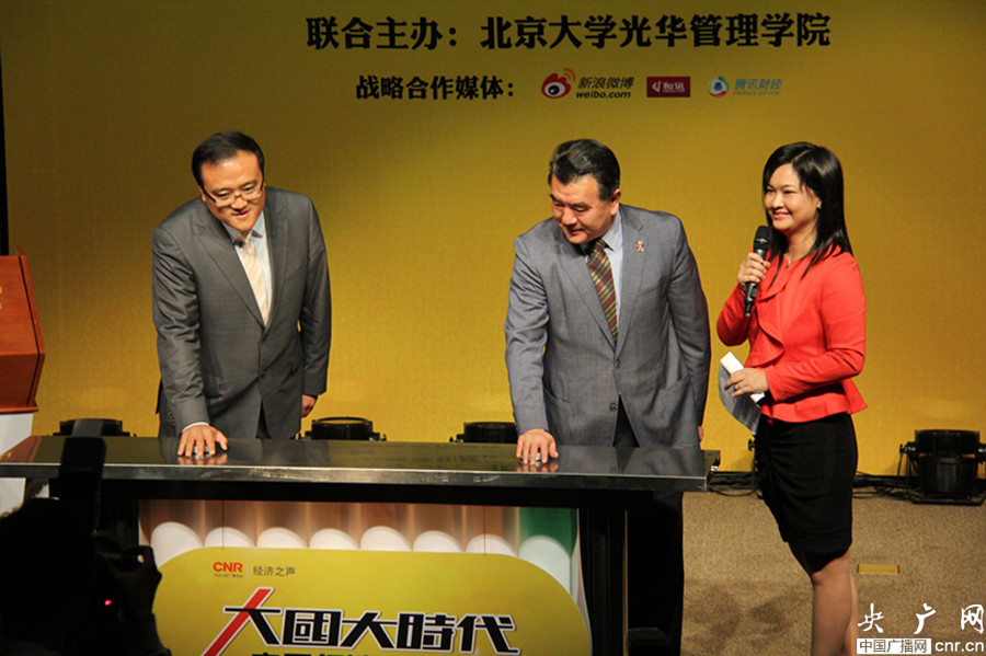 中央人民廣播電臺臺長王求(左二)和北京大學光華學院黨委書記冒大衛(左一)共同啟動《大國大時代》(央廣網 李雪南 攝)