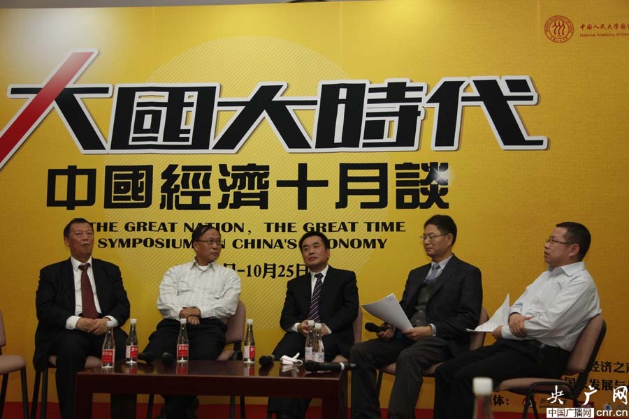 10月16日,由經濟之聲、央廣網主辦的《大國大時代----中國經濟十月談》系列時事報告會之四“價格談”,在人民大學舉行。圖為圖為國務院參事室特約研究員姚景源、國家信息中心首席經濟師范劍平、國家發改委價格司副司長周望軍、中國人民大學財政金融學院副院長趙錫軍、經濟之聲觀察員陳愛海(由左至右排序)(央廣網 趙娜娜/攝)