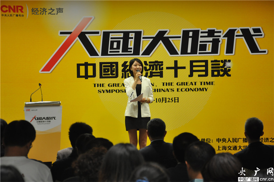 10月20日,由中央人民廣播電臺經(jīng)濟(jì)之聲、央廣網(wǎng)主辦的《大國大時代----中國經(jīng)濟(jì)十月談》系列時事報告會之五“貨幣談”,在位于中國人壽中心的上海交通大學(xué)上海高級金融學(xué)院舉行。今天的主題是《貨幣談:大國的錢怎么辦?》。圖為經(jīng)濟(jì)之聲主持人 梁靖(央廣網(wǎng) 李靜/攝)