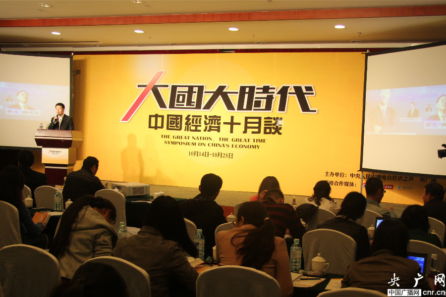 10月22日,由中央人民廣播電臺經濟之聲、央廣網主辦的《大國大時代----中國經濟十月談》系列時事報告會之六“農村談”,在廣電國際酒店舉行。今天的主題是《農村談:農民與土地是歷史性地說再見了嗎?》。圖為報告會現場(央廣網 于琦/攝)