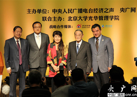 主持人:在1898年,北京大學的前身,京師大學堂正式成立,其宗旨就是希望能夠開篇辟地希望能夠推陳出新,那1994年的時候,我們光華管理學院成立了,成立了中國最為一流的商學院,也是培養了一批又一批頂級的經濟人才,時至今日在這個期間,馬上就要召開黨的十八屆三中全會,中國的經濟必將翻開全新的一頁,而中央人民廣播電臺經濟之聲作為唯一覆蓋全國財經的頻率,我們有責任和在座的各位嘉賓、各位師生一同來梳理來共同的尋找歷史的方向和中國經濟的脈絡,接下來讓我們把最熱烈的掌聲送給我們光華管理學院的創辦人,著名的經濟學家厲以寧先生。