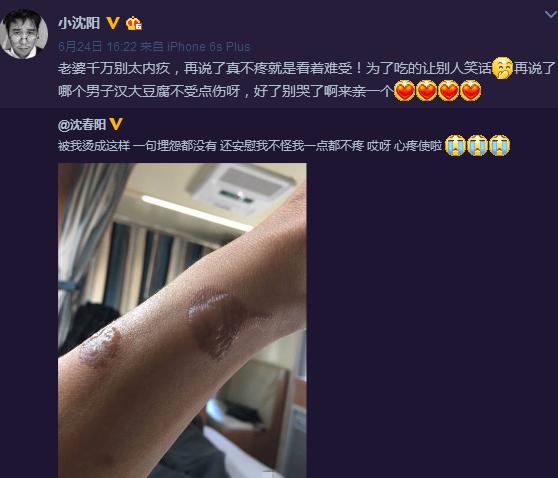 6月24日,沈春陽在微博中發布了一張被燙傷手臂的照片,“被我燙成這樣,一句埋怨都沒有,還安慰我不怪我一點都不疼。哎呀!心疼死啦!”