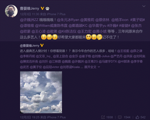 不料隨后@曹晏維Jerry再次發(fā)微博表示:“三年間原來(lái)合作了這么多藝人,好希望大家都能來(lái)!”又附上一份長(zhǎng)長(zhǎng)的明星大咖名單。網(wǎng)友只能表示:“走過(guò)最深的路,就是你的套路”。看來(lái)2016酷狗直播繁星音樂(lè)盛典的明星出席名單仍然深埋在一片迷霧中,不過(guò)無(wú)論如何,@曹晏維Jerry都為大家劃定大致范圍了,至于究竟有誰(shuí)?粉絲們還是乖乖等官方消息吧~