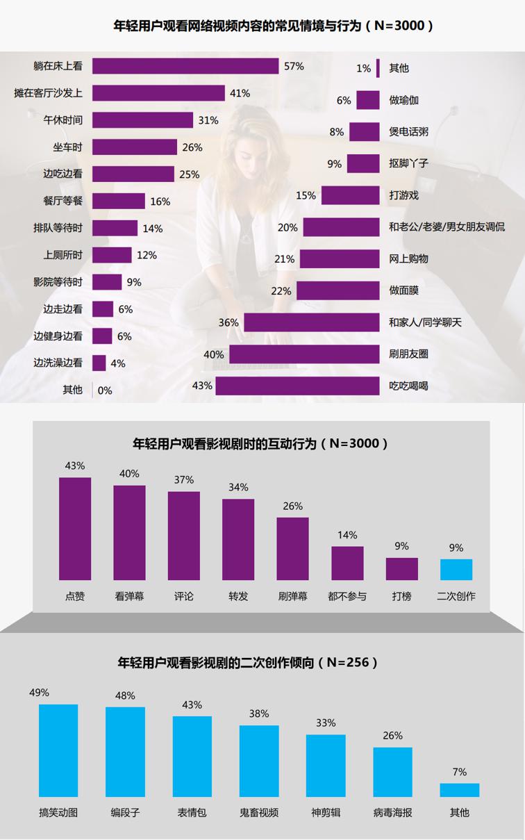 隨著劇綜類型的豐富、觀劇方式的多元化,觀看視頻在今天不僅是單純的娛樂手段,而成為年輕人生活的一種方式。尤其懶懶的癱在床上和沙發上看劇,是年輕人最愛的觀劇姿勢。同時,數據顯示,100%的年輕人在看劇的同時,會附帶其他娛樂,其中吃吃喝喝、刷盆友圈是追劇最佳伴侶。