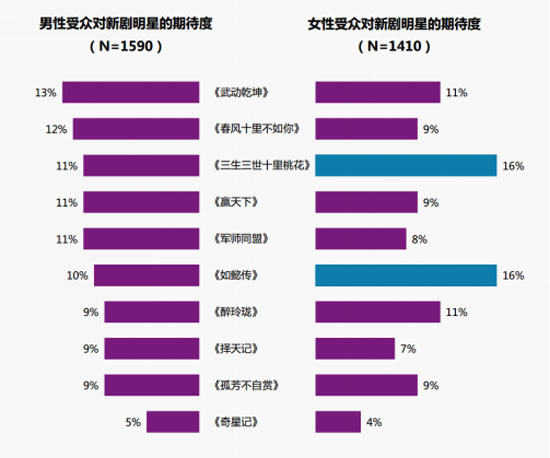 男人來自金星,女人來自火星?熱門IP改編的《三生三世十里桃花》,成功跨越性別審美差異,成2017年受眾最期待的作品之一。騰訊靠大手筆一舉拿下的《如懿傳》,深諳女性用戶喜好。比起押寶超級IP,優酷2017不但包攬男性用戶最期待的TOP5,同時憑借《武動乾坤》和《三生三世十里桃花》成功搶灘女性受眾,“頭部內容+垂直熱門”的多元化內容布局更易霸屏。