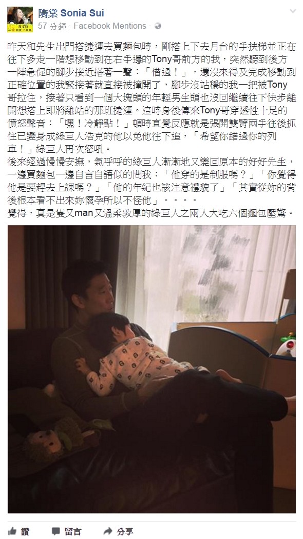 隋棠22日在臉書寫下長文,昨天和Tony搭著捷運準備要出門時,搭上下月臺的手扶梯時,原先和老公并肩的她,正要往下一階到右前方時,突然聽到后面傳來急促的腳步聲配上一句:“借過。”