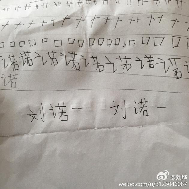 2月8日晚,劉燁[微博]更新微博曬教劉燁練字的照片,并寫道:“在家指導孩子練字,從名字開始,小諾進步挺快的,但還是控制不好力道,我讓他寫了遍名字,我再寫一遍讓他看看差距。”照片中看出,諾一寫的是自己的名字,一次比一次寫得好,進步很大,居然趕上爸爸劉燁的字跡了,非常的有天賦聰明。