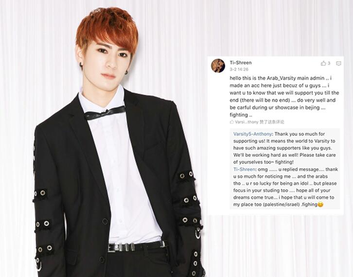 在微博中,海外粉絲表示自己是VARSITY-V組合阿拉伯地區(qū)粉絲站的負(fù)責(zé)人,特地為了VARSITY-V組合注冊(cè)了微博賬號(hào),希望表達(dá)自己對(duì)組合的支持,也希望團(tuán)隊(duì)成員能夠表現(xiàn)越來越好,注意身體,并且期待VARSITY-V在北京的舞臺(tái)表演。暖心的安東尼在微博用英文回復(fù)了粉絲的關(guān)心,讓粉絲十分驚喜。