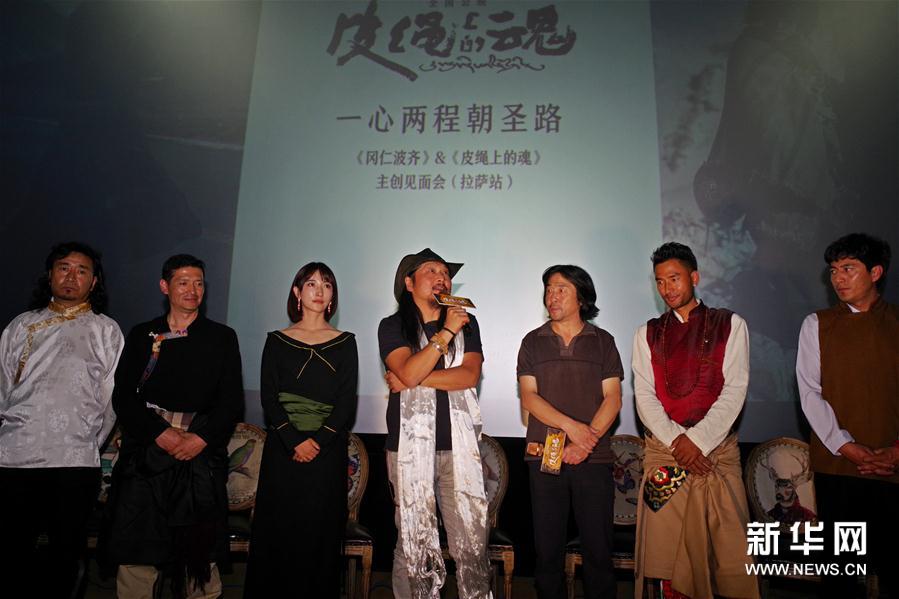 電影《皮繩上的魂》主創(chuàng)人員在拉薩首映式上與觀眾交流(7月24日攝)。 7月24日,西藏首部魔幻現(xiàn)實主義電影《皮繩上的魂》在拉薩舉行首映式。影片根據(jù)西藏作家扎西達娃的兩部短篇小說《西藏,系在皮繩結上的魂》和《去拉薩的路上》改編而成,由導演張楊執(zhí)導,扎西達娃編劇。新華社記者 劉東君 攝