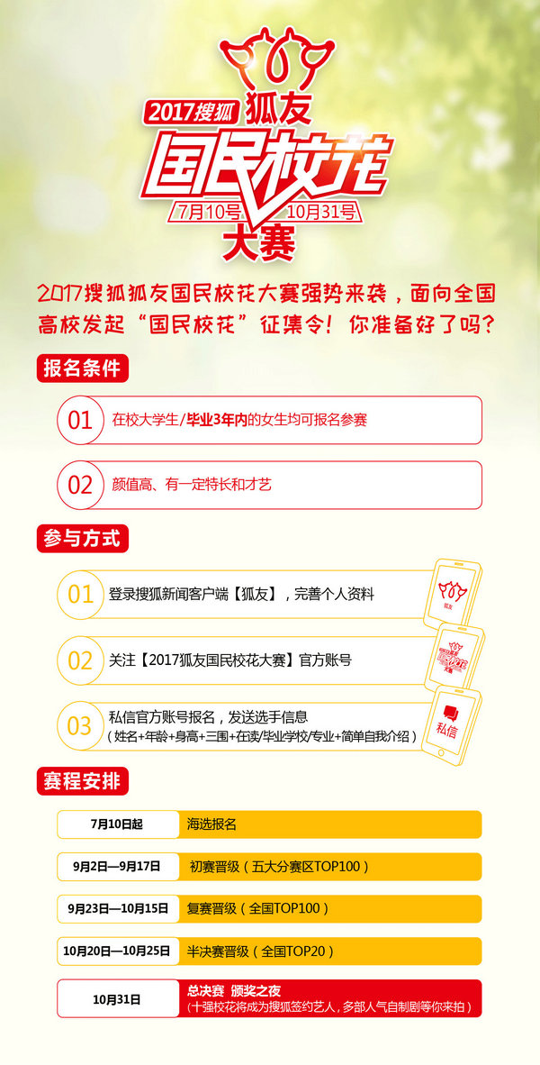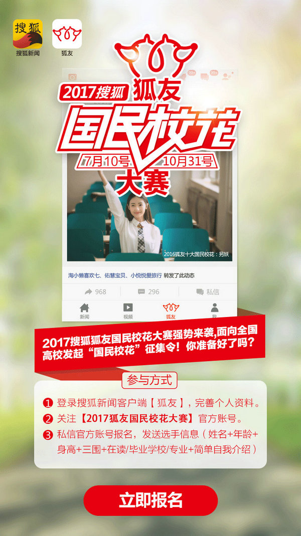參賽要求十分簡單:在校大學生或畢業3年內的女生,只需要“登錄”狐友完善個人資料,并關注“2017狐友國民校花大賽”官方賬號,私信發送報名信息(學校/畢業學校、三圍、身高、年齡),3天之內,與官方賬號“2017狐友國民校花大賽”互關,即可獲得參加海選的資格。