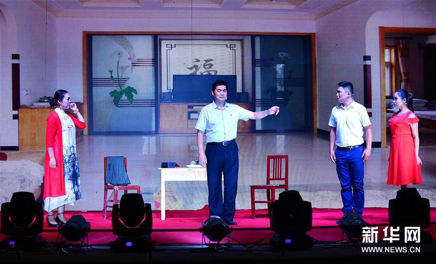 9月7日晚,河南濮陽精準扶貧文藝巡演活動走進清豐縣馬村鄉白馬楊村,演員在表演四平調《不講排場又如何》。為充分發揮文藝作品在扶貧攻堅工作中的“扶志”和“扶智”作用,河南濮陽圍繞扶貧攻堅主題積極組織文藝創作,廣泛開展文藝宣傳活動。8月中旬至10月中旬,濮陽將在全市五縣一區開展文藝巡演活動100場次。新華社記者馮大鵬攝
