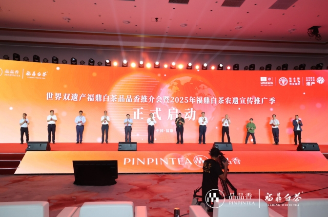 活動(dòng)隨后還舉辦了2025年福鼎白茶農(nóng)遺宣傳推廣季啟動(dòng)儀式,隨著“3、2、1”的倒數(shù)聲,12位領(lǐng)導(dǎo)嘉賓共同按下啟動(dòng)鍵,現(xiàn)場(chǎng)掌聲雷動(dòng)。按下的不僅是啟動(dòng)鍵,更是雙遺白茶全球化的“加速鍵”——標(biāo)志著福鼎白茶將以“人類(lèi)非遺+全球農(nóng)遺”的雙重身份,系統(tǒng)性推進(jìn)國(guó)際傳播:既通過(guò)文化推薦官講述雙遺故事,也依托行業(yè)協(xié)會(huì)推動(dòng)品牌出海,更借助品品香等企業(yè)持續(xù)開(kāi)拓的海外布局,讓雙遺白茶從太姥山下的地域特產(chǎn),成為全球消費(fèi)者感知中國(guó)茶文化的“馨香名片”。