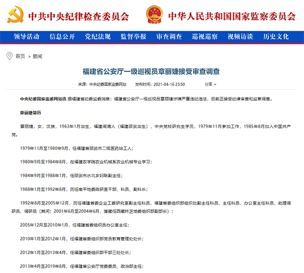 央廣網(wǎng)福州4月17日消息 福建省公安廳一級(jí)巡視員章麗婕涉嫌嚴(yán)重違紀(jì)違法,目前正接受紀(jì)律審查和監(jiān)察調(diào)查。
