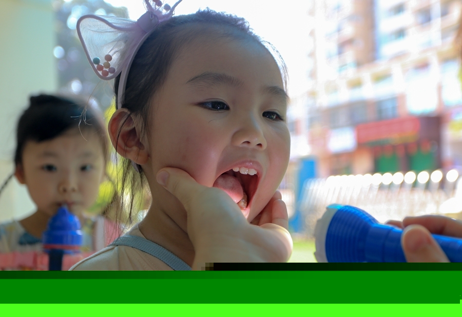 開(kāi)園第一天晨檢,一名小女孩張開(kāi)嘴露出一口潔白的牙齒。新華網(wǎng) 肖和勇 攝 -
