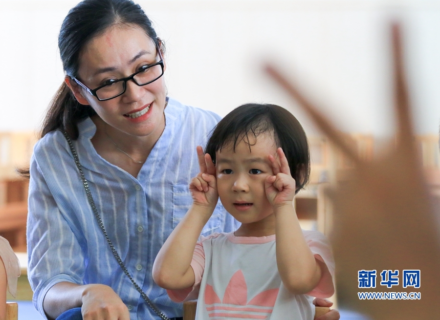 握個(gè)手,交朋友。一名小女孩正在與老師(右)互動(dòng)。新華網(wǎng) 肖和勇 攝 -